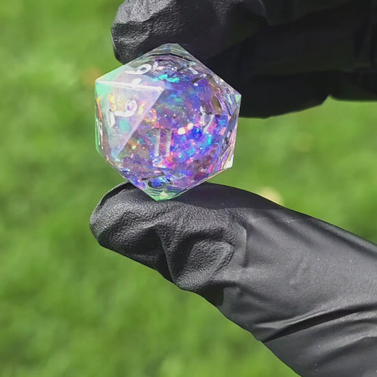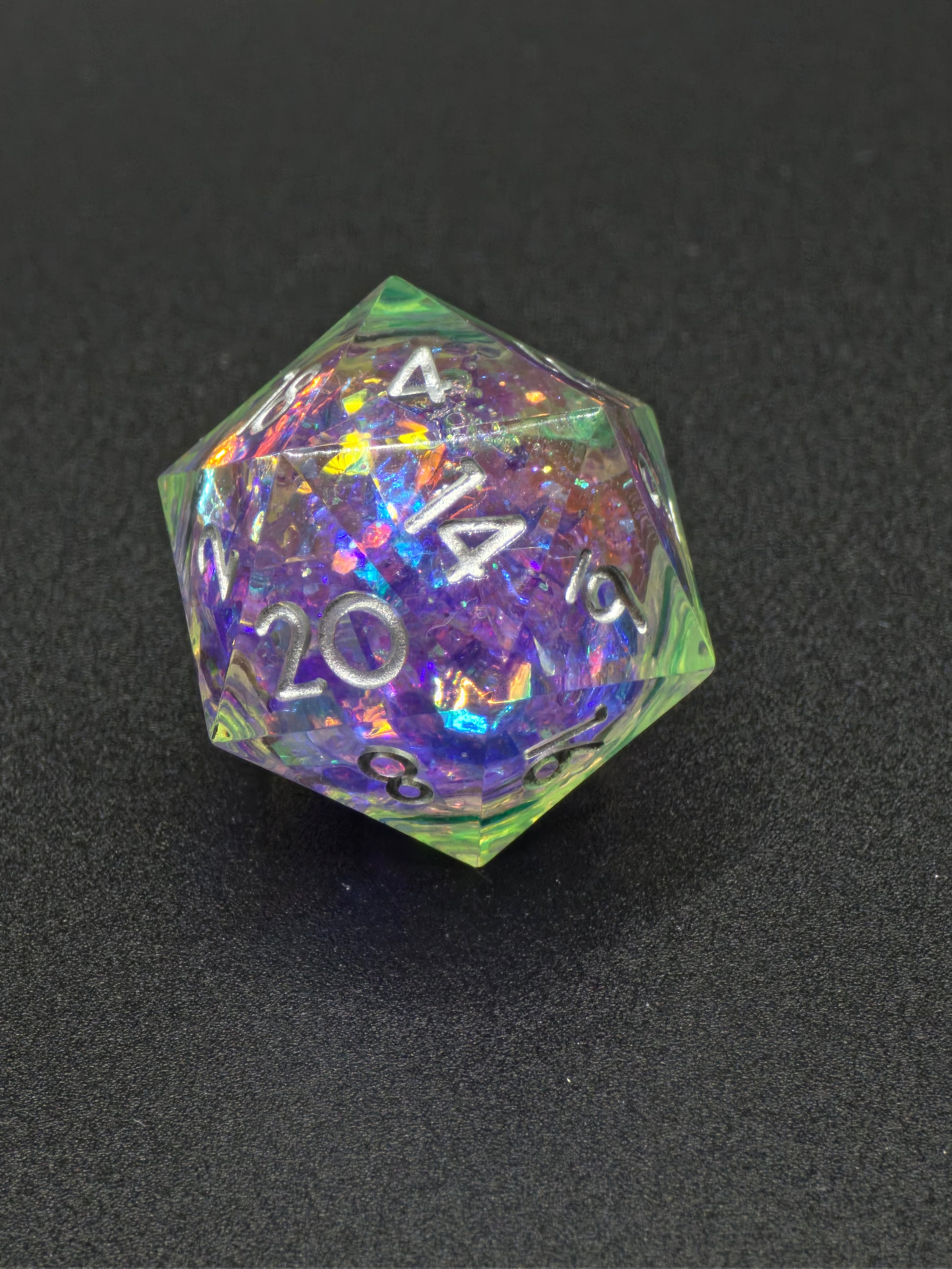 Dieser handgefertigte **einzeln D20 Liquid Core Würfel** in der Variante **„Acid Zitrone“** vereint klare Transparenz mit irisierendem Farbspiel – von giftig-grünem Rand bis zu leuchtenden violetten und goldenen Reflexen im Inneren.