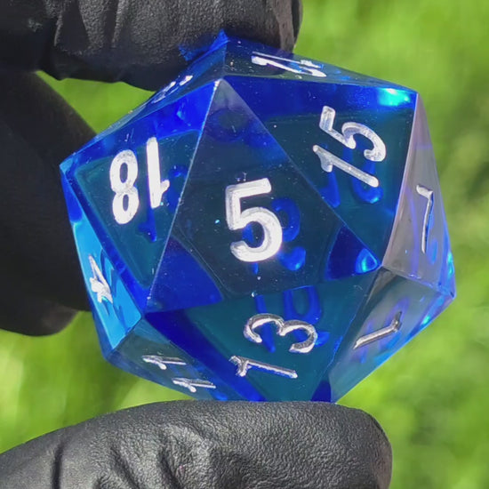 Großer Polyedrischer D20 Würfel 35 mm – Ocean Blue Crystal Dice | Handgemachter Resin Würfel in Tiefblau mit Silberzahlen | TTRPG DnD