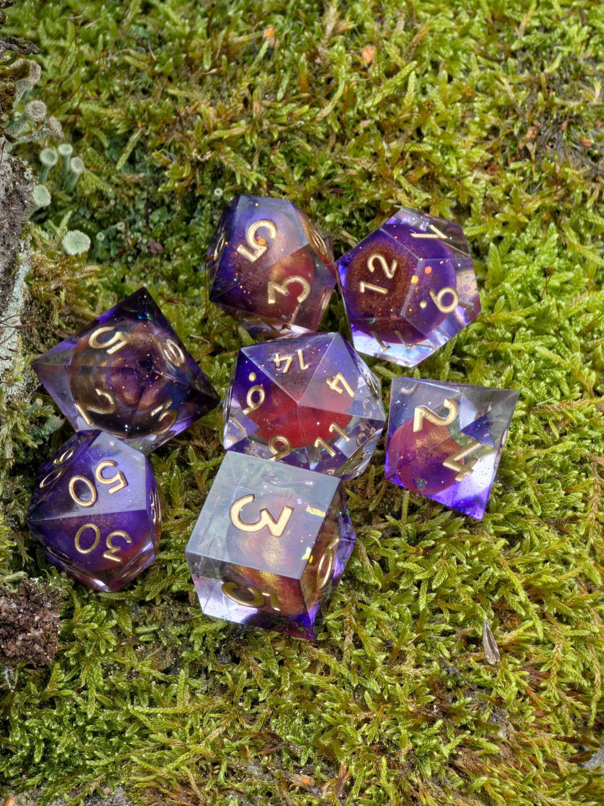 Polyedrischer Planeten Kosmos DnD Würfelset 7 Stück – Handgemachte Resin Dice mit Universum-Effekt & goldenen Zahlen | Galaxy Fantasy Würfel