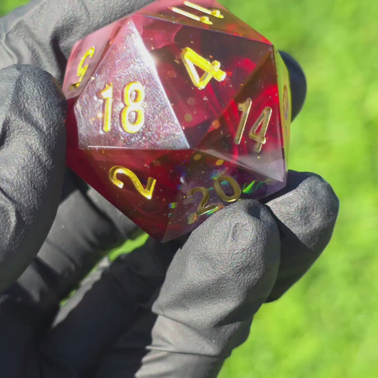 Polyedrischer D20 Chonk Würfel 35mm – Blood Mist Dice | Handmade DnD Würfel | Rot Weißer Nebel Gold – Gothic Fantasy Dice
