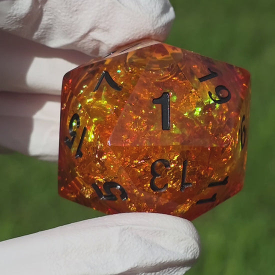 Polyedrischer D20 Würfel 35mm – Liquid Core Bernstein Amber Look – Handgemachter Resin Würfel für DnD, TTRPG & Sammler