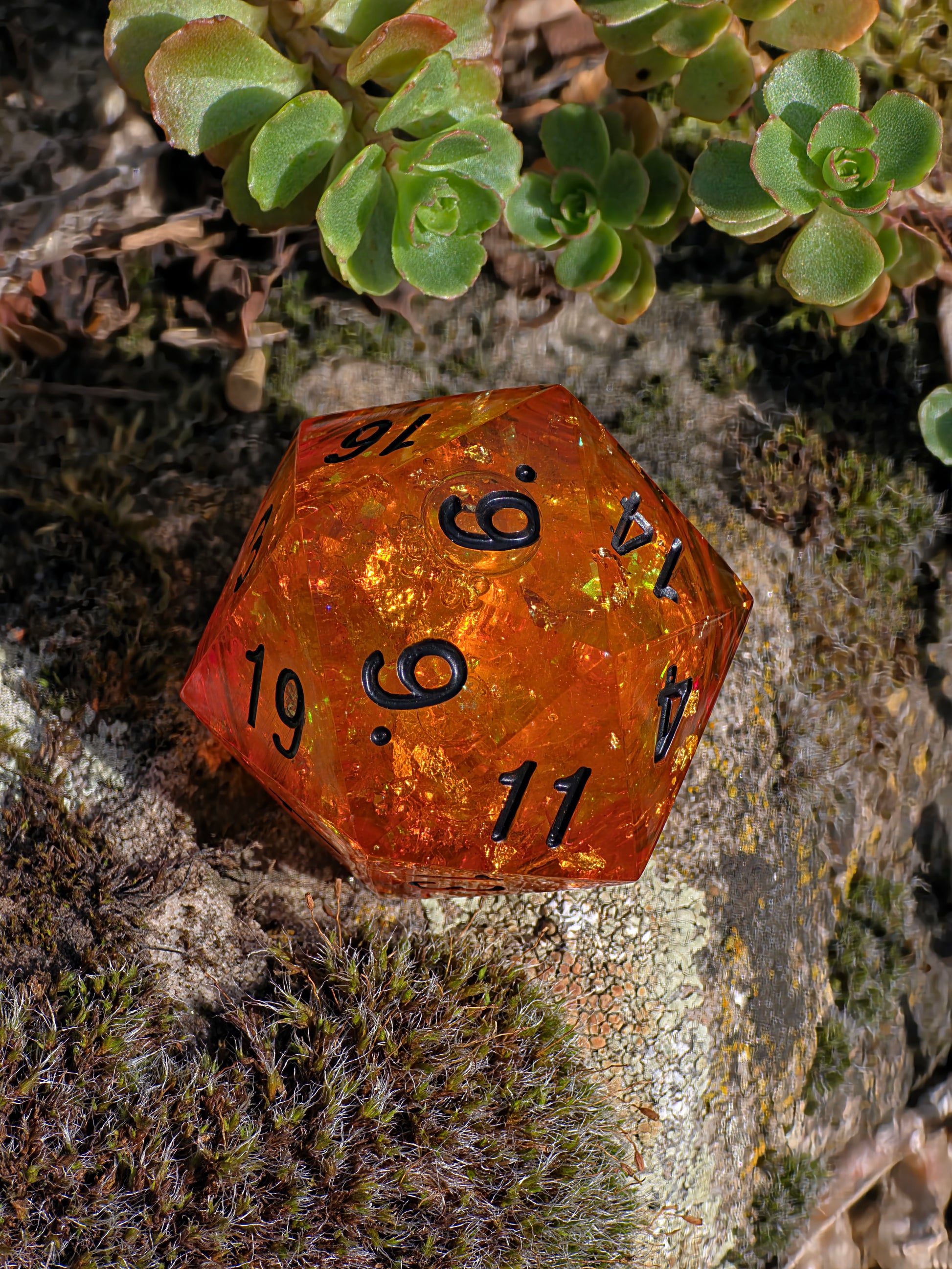 Dieser außergewöhnliche D20 Chonk Würfel im L-Format (35mm) wurde in sorgfältiger Handarbeit gefertigt und fängt das warme Leuchten von echtem Bernstein ein. Goldene Flakes tanzen im tiefen Orange, während der bewegliche Liquid Core im Inneren bei jeder Drehung sanft in Bewegung gerät – fast wie ein in Harz gefangener Sonnenstrahl.