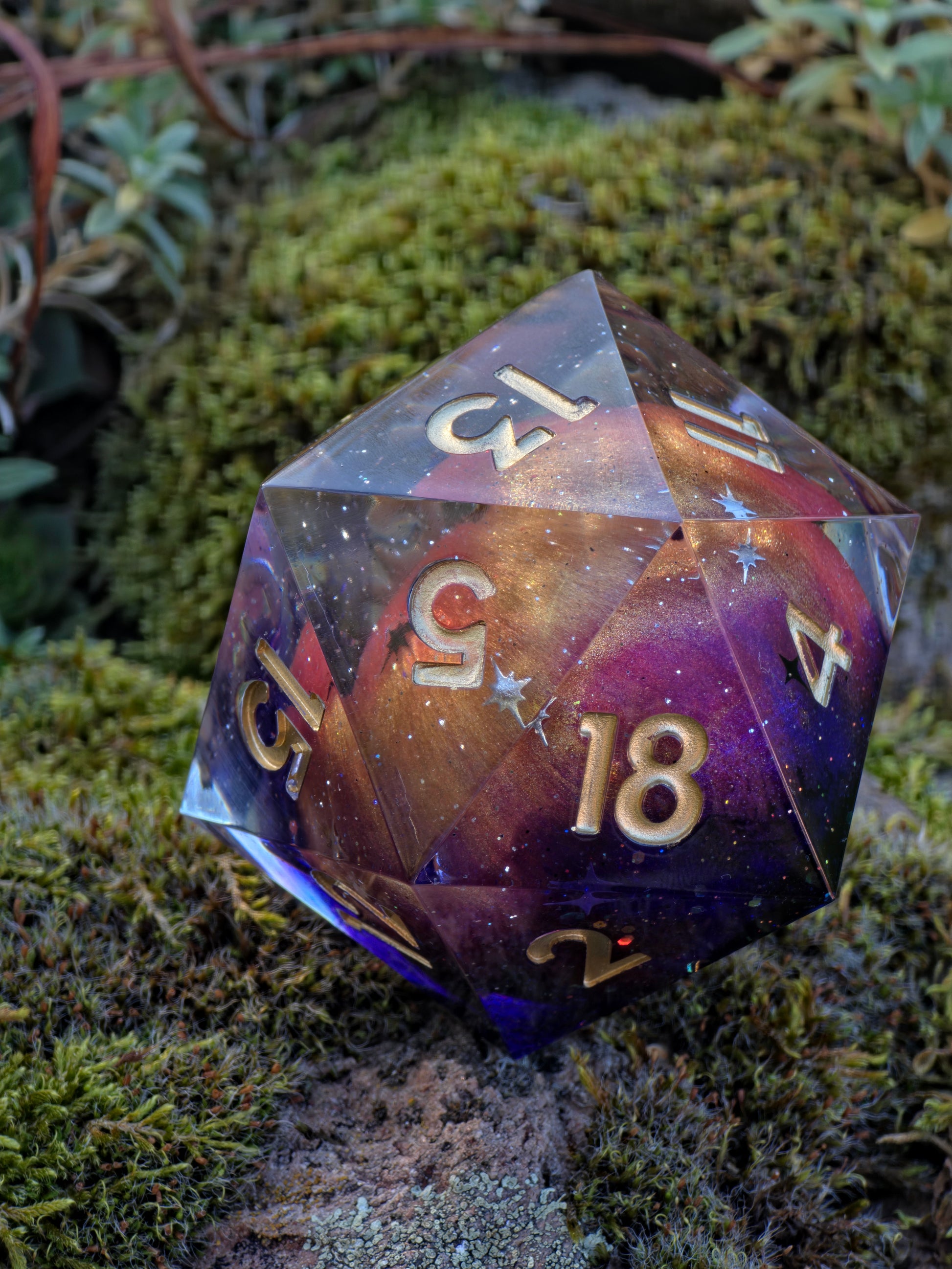 🪐 Ein Stück Universum in Ihrer Hand – dieser handgefertigte XL D20 (ca. 55 mm) birgt im Inneren eine leuchtende Planetenkugel, umgeben von feinem Sternenstaub und goldenen Lichtwirbeln.