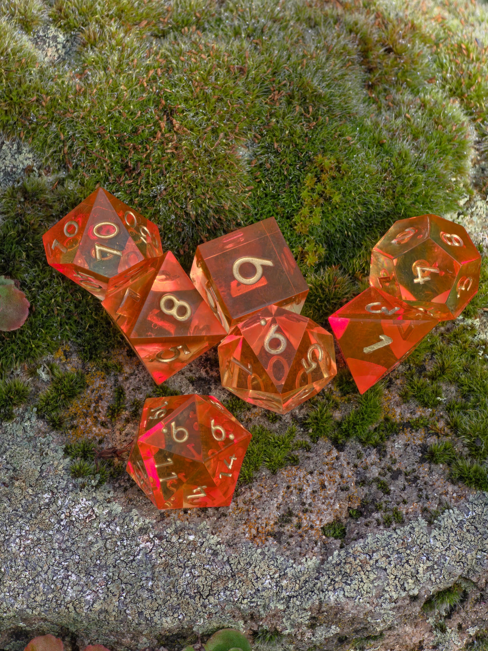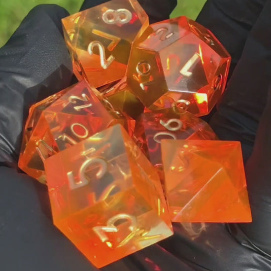 Polyedrischer DnD Würfelset 7 Stück – Sunflare Dice | Handgemachte Resin Würfel in Orange Gelb Transparent mit Goldzahlen | TTRPG DnD Pathfinder