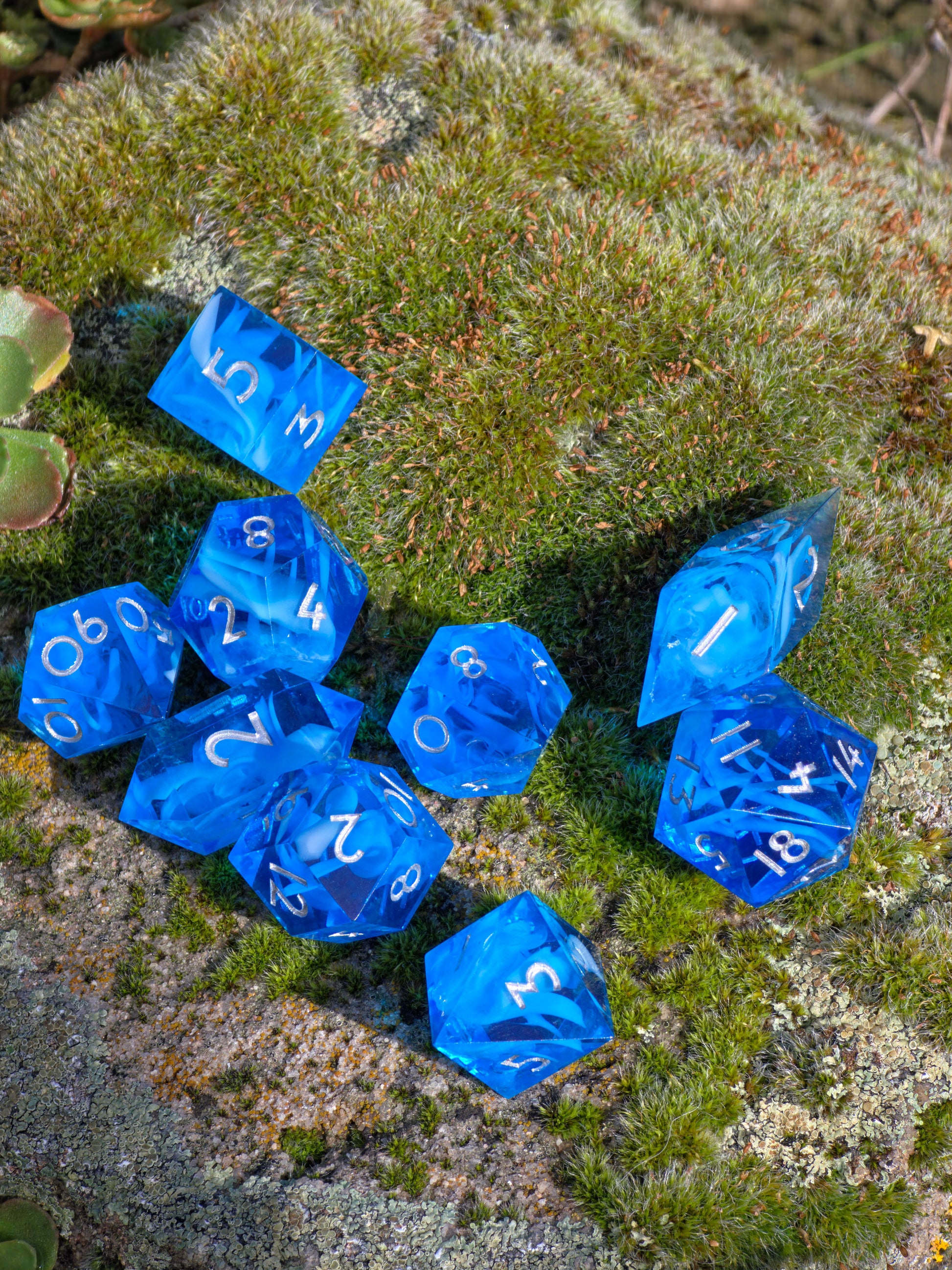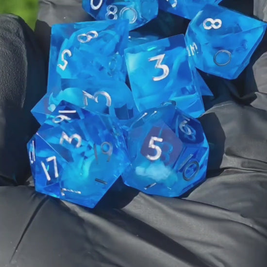 Polyedrischer DnD Würfelset 9 Stück – Arctic Sky Cloud Dice | Handgemachte Resin Würfel in Eisblau Transparent mit Cloud-Effekt & Silberzahl