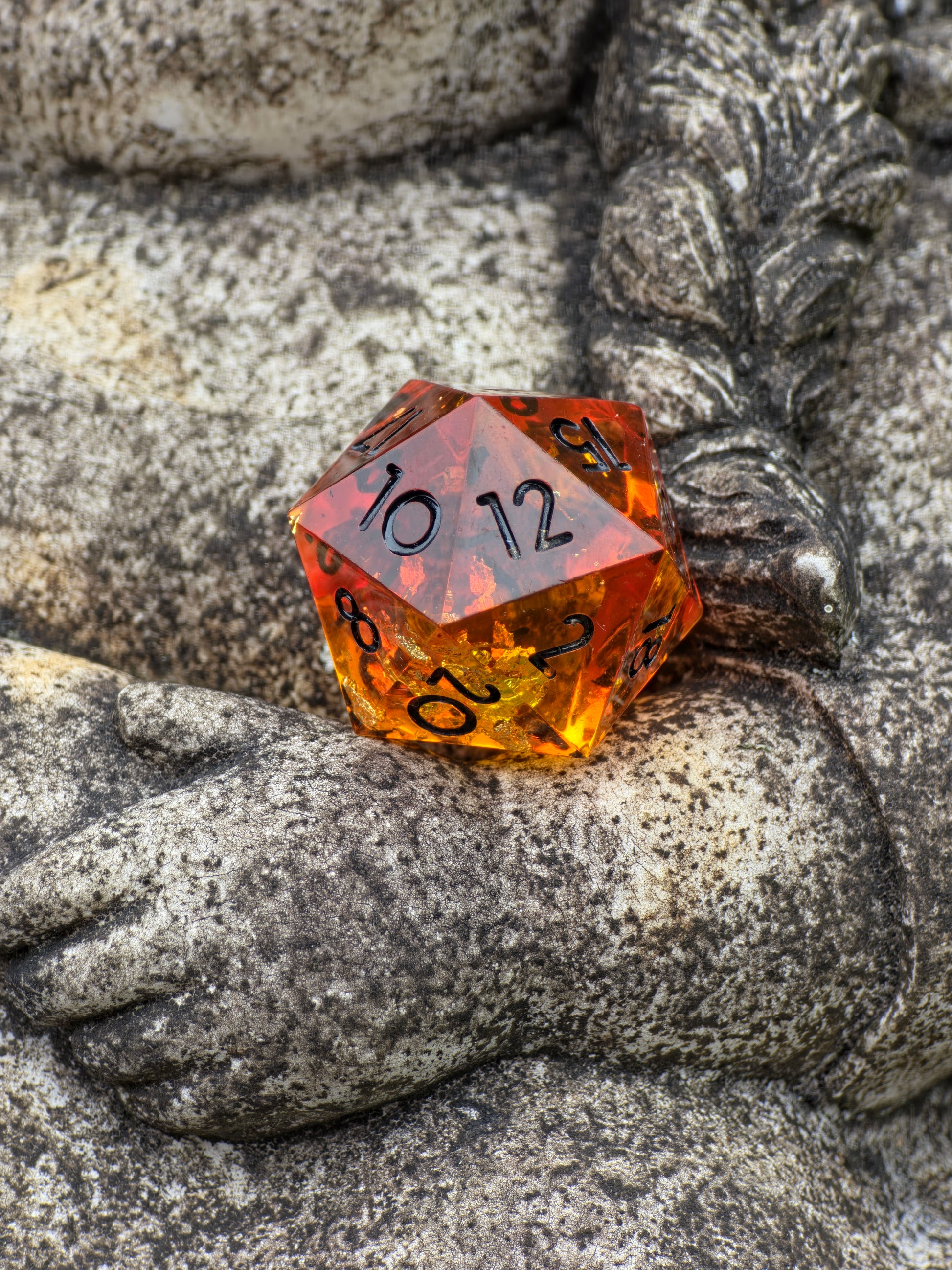 🧡 Ein einzelner Funken aus Bernstein – dieser handgefertigte D20 fängt das warme Licht eines Sonnenstrahls im Harz ein.