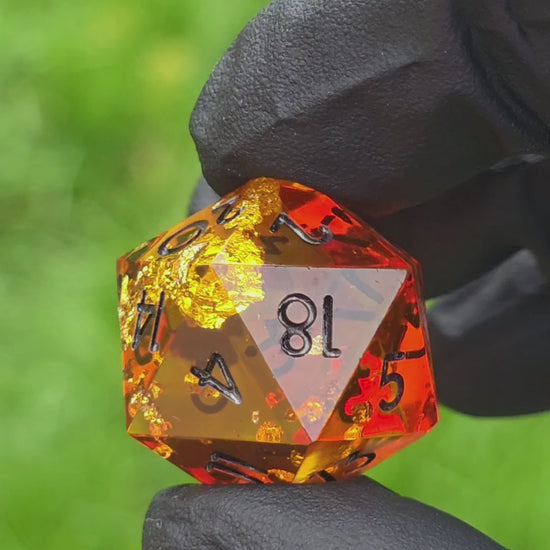 Polyedrischer Einzelner D20 – Amber Bernstein Stil | Handgemachter Resin W20 Würfel in Gold Orange Transparent mit Blattgold | Standardgröße