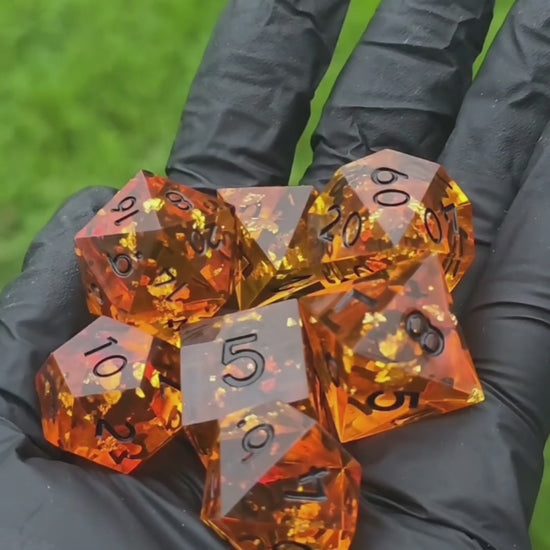 Dieses 7-teilige polyedrische Resin Dice Set vereint warme Gold- und Orangetöne mit funkelnden Einschlüssen, die an echten Bernstein erinnern.