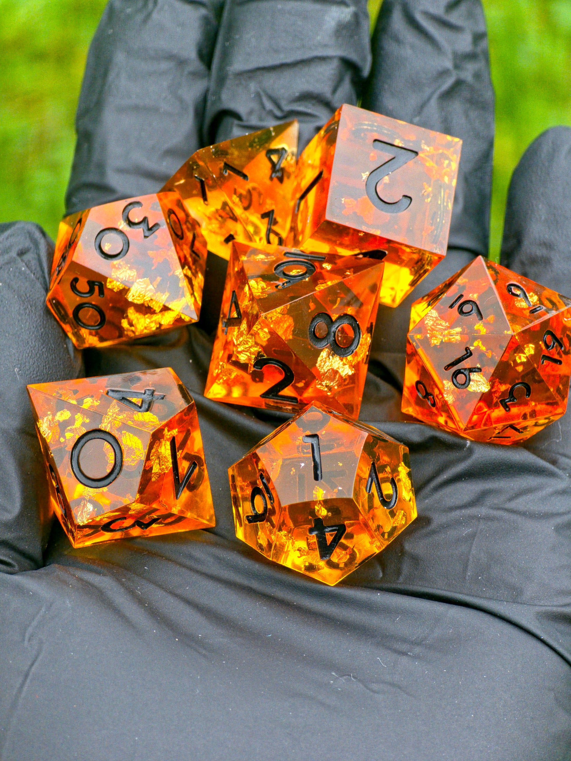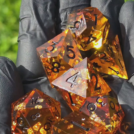 Polyedrisches DnD-Würfelset 7 Stück – Amber Glow Dice Set | Handgemachte Resin Würfel in Gold Orange Transparent mit Bernstein-Stil | TTRPG